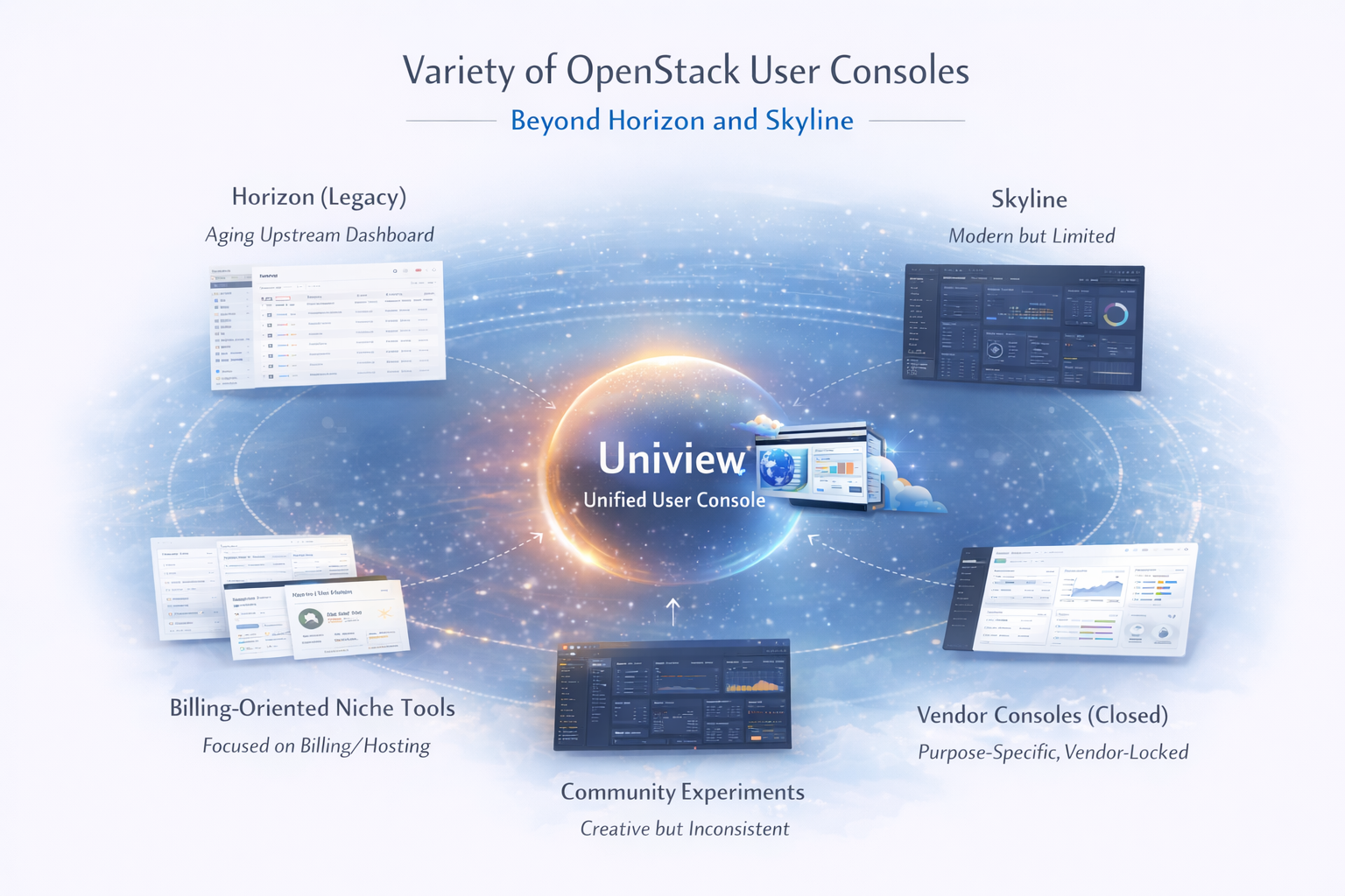 To conclude, the OpenStack ecosystem delivers powerful infrastructure capabilities, but the user console still requires per business last‑mile engineering to meet real operational needs. Horizon is aging, Skyline remains incomplete, vendor‑specific consoles are narrow and closed, and community tools tend to focus on niche use cases. Modern clouds demand a modern console—one that is fast, unified, comprehensive, and capable of operating seamlessly across multiple clusters and regions. Uniview fills this gap, providing a next‑generation user console that works with any OpenStack deployment and is built for enterprise‑grade operations at scale.