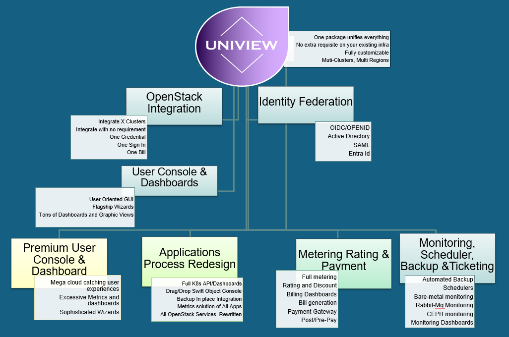 Univew is comprehensive OpenStack Enterprise Ready solution for both use-cases of Public Clouds and Premium Private Clouds. It bundles a new generation of OpenStack User Console, Monitoring System, Public Cloud Billing and Supporting System into one platform. Uniview is also an crossover of User console and CMP (Cloud Management Platform) that it is a strong solution of cluster federation, a high desired feature that One Console, One Sign-In to access and apply governance to multiple indepedent OpenStack installs, regardless shared components or shared nothing among them.