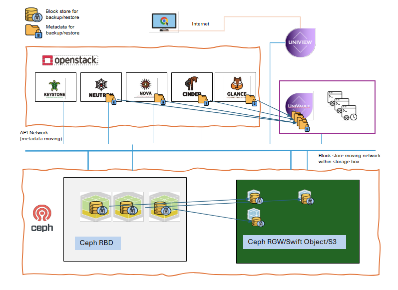 Unlike many other solutions that often install movers or executors into the controller and hypervisor—significantly increasing solution cost and overhead and being too intrusive—Uniview Vault fully leverages Uniview core and the OpenStack API only to accomplish the same tasks efficiently. Nothing is required on Nova/Cinder controller, nova‑compute/Ceph; no proxy or agents are needed, while it still achieves the desirable filesystem‑consistent backups required to meet industry standards in the OpenStack world.Manageable, transparent, operable, and affordable — a perfect balance of open source and thin proprietary engineering